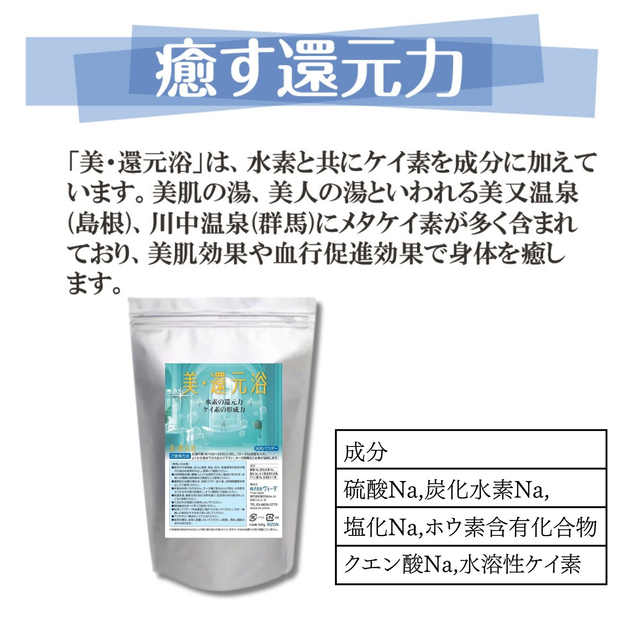 【日々の入浴で癒し・整え・磨く 水素パワーで、美・還元】美・還元浴(浴用パウダー)500g×10 JAN:459564021102/22509 |