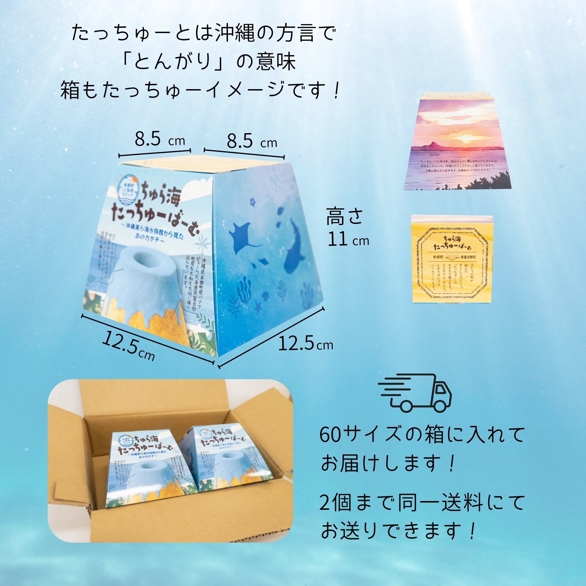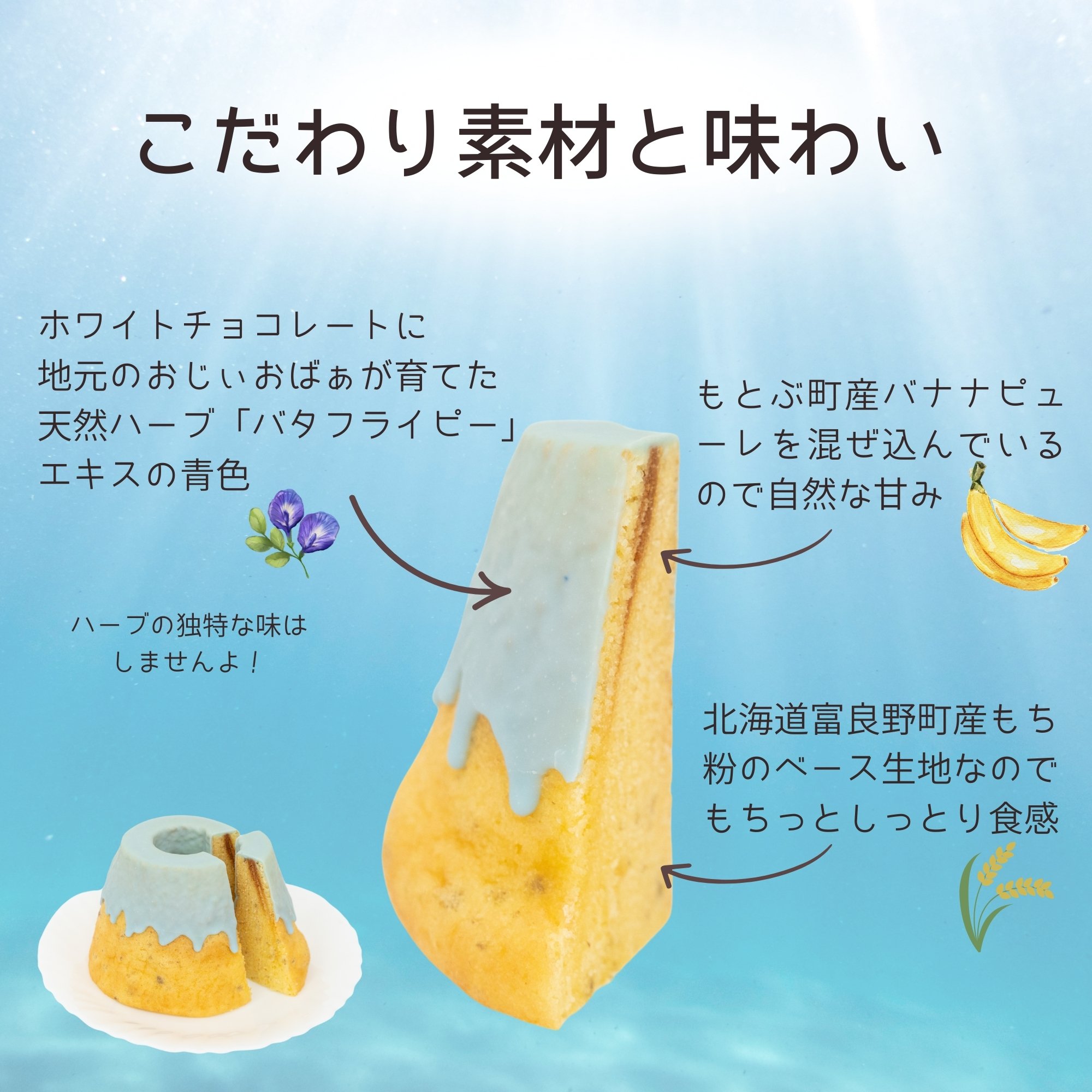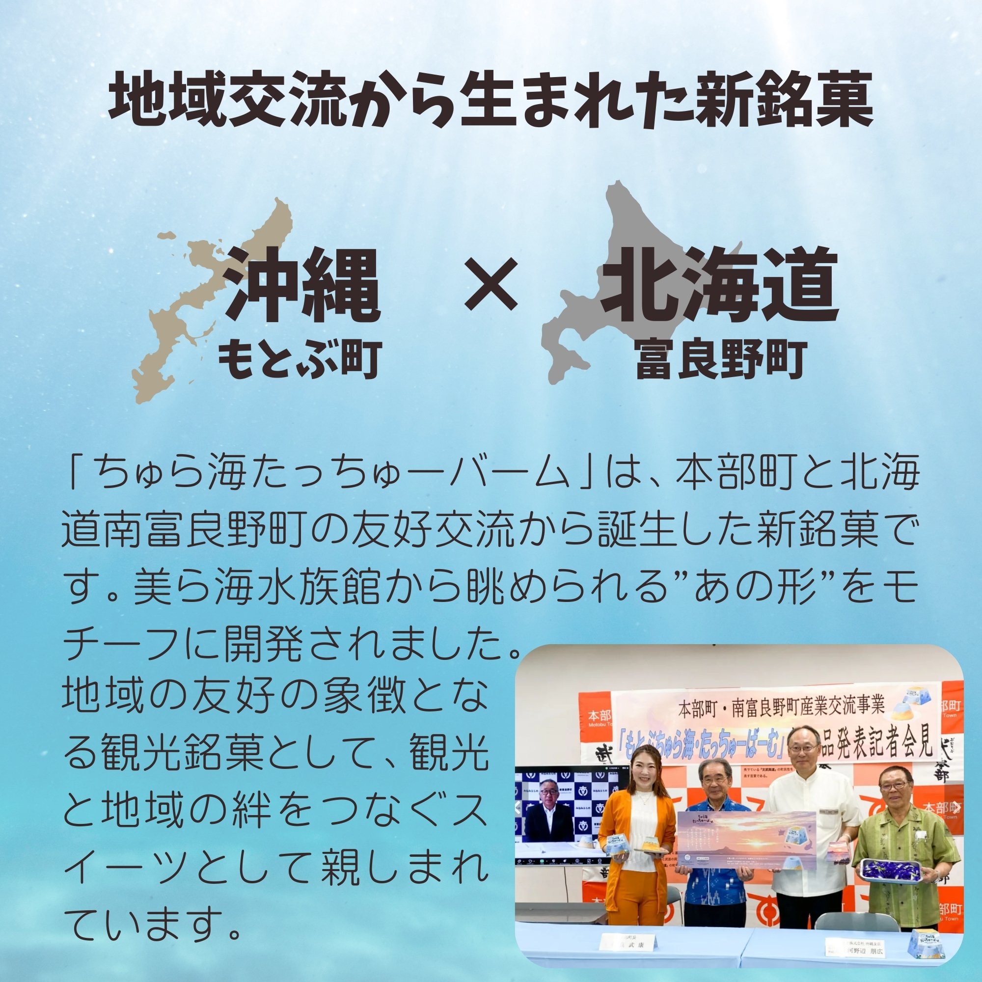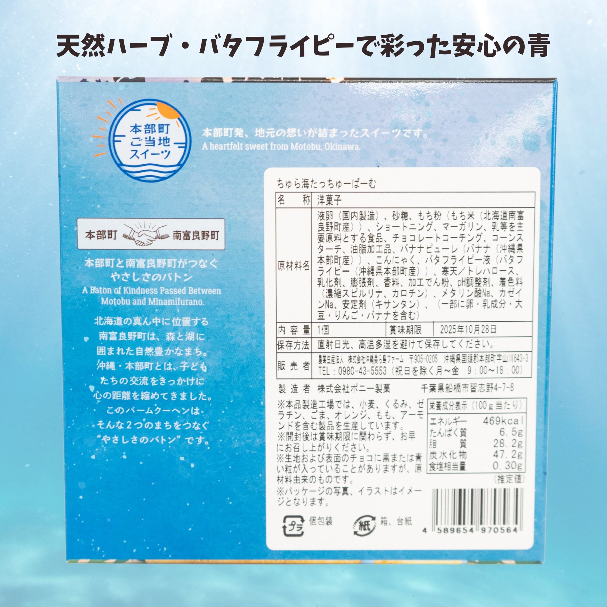 沖縄新名産!「ちゅら海たっちゅーバーム」は、美ら海水族館から眺められる印象的な“あの形”をモチーフに誕生した、本部町発の新しいお土産スイーツです。本部産バナナの自然な甘みと、北海道南富良野産のもち米によるもっちり食感が絶妙な美味しさ!さらに、美ら海と青空をイメージした鮮やかな青いコーティングは合成着色料を一切使わず、天然ハーブ「バタフライピー」を使用しています。安心で優しい味わいに、地域の絆から生まれたストーリーを重ねた、ギフトや旅のお土産に最適なバームクーヘンです。クール便でお届けします。 |