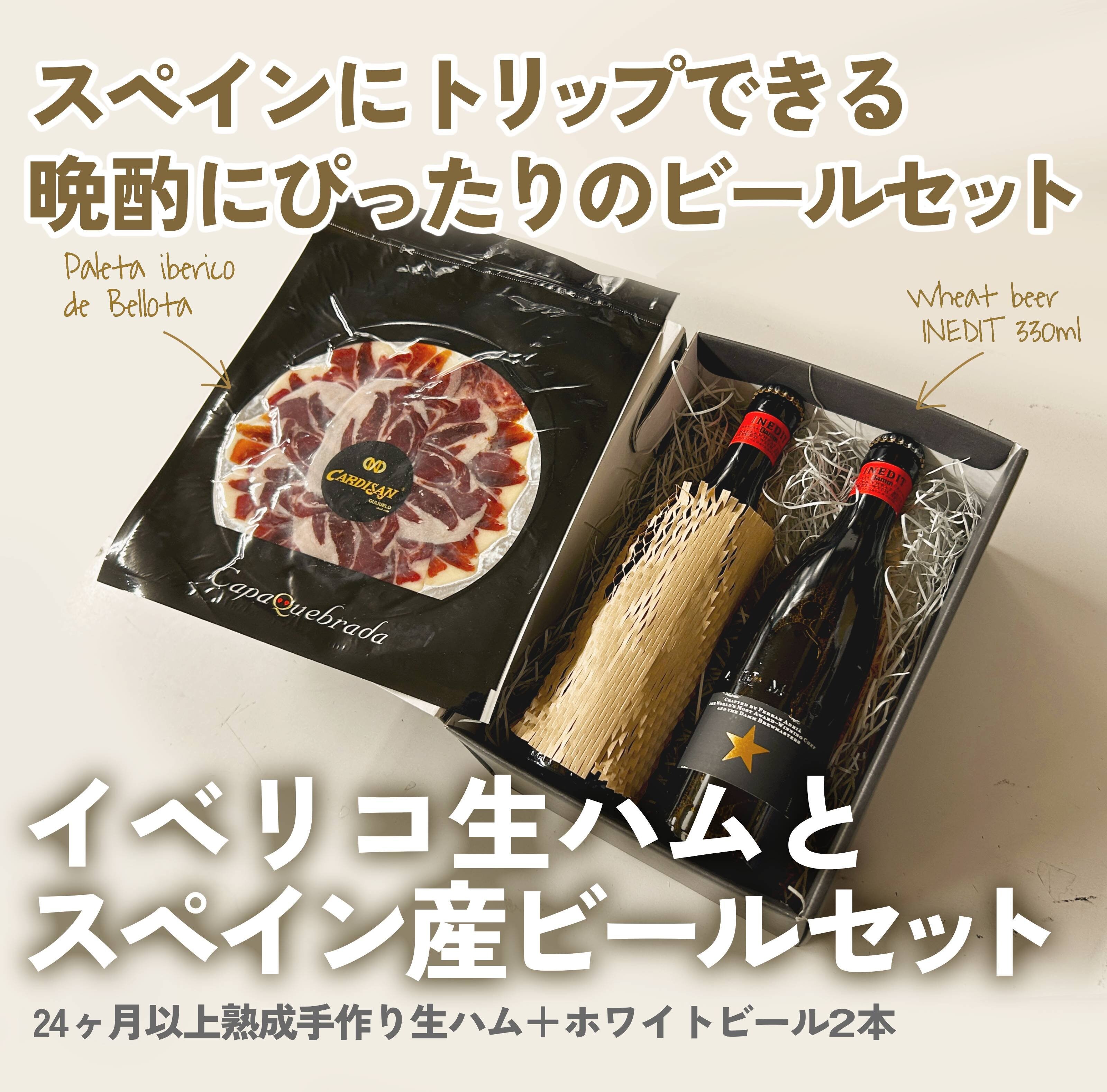 スペイン産極上のホワイトビールINEDIT「イネディット」2本と、生ハム職人の手作りイベリコ生ハムのセットです。 |