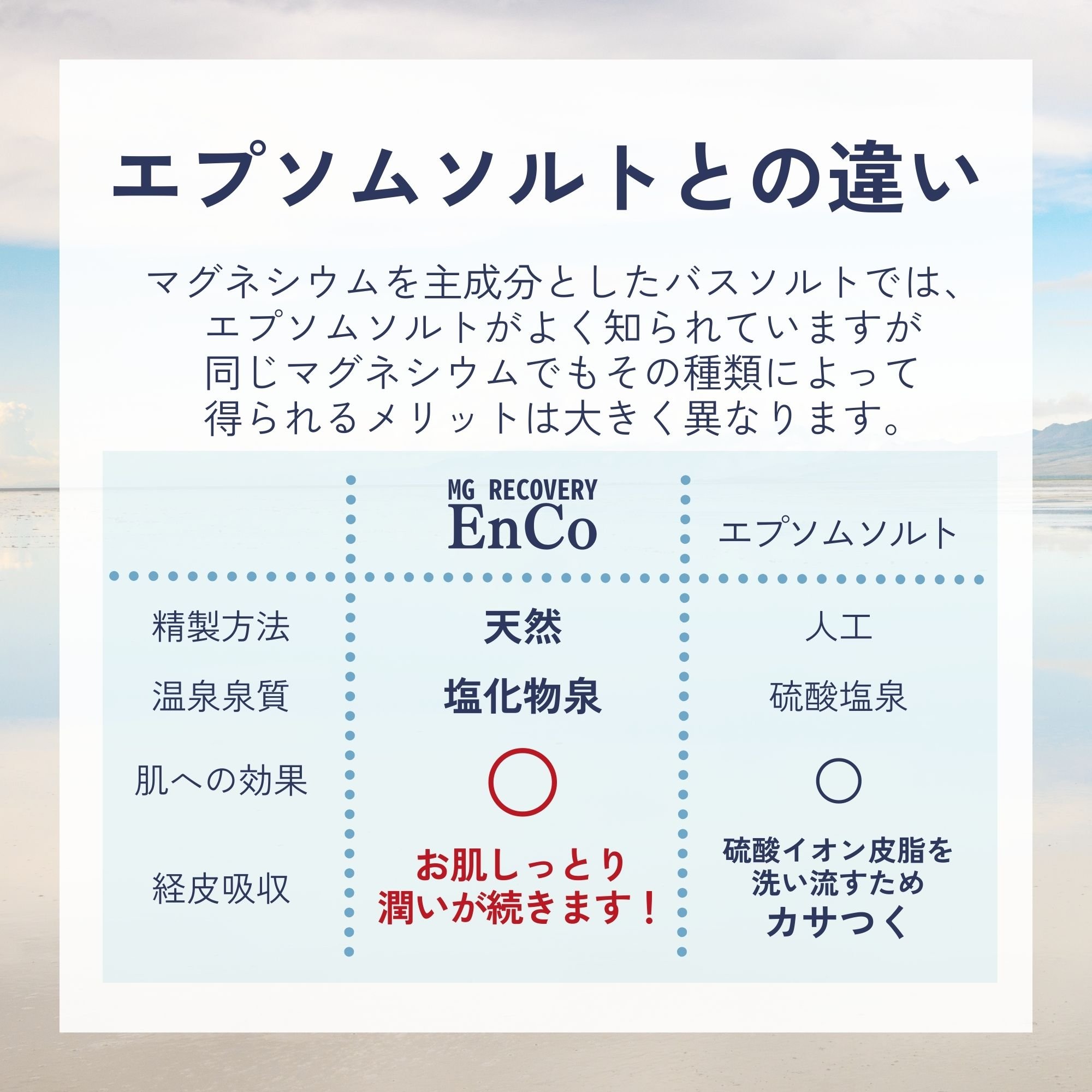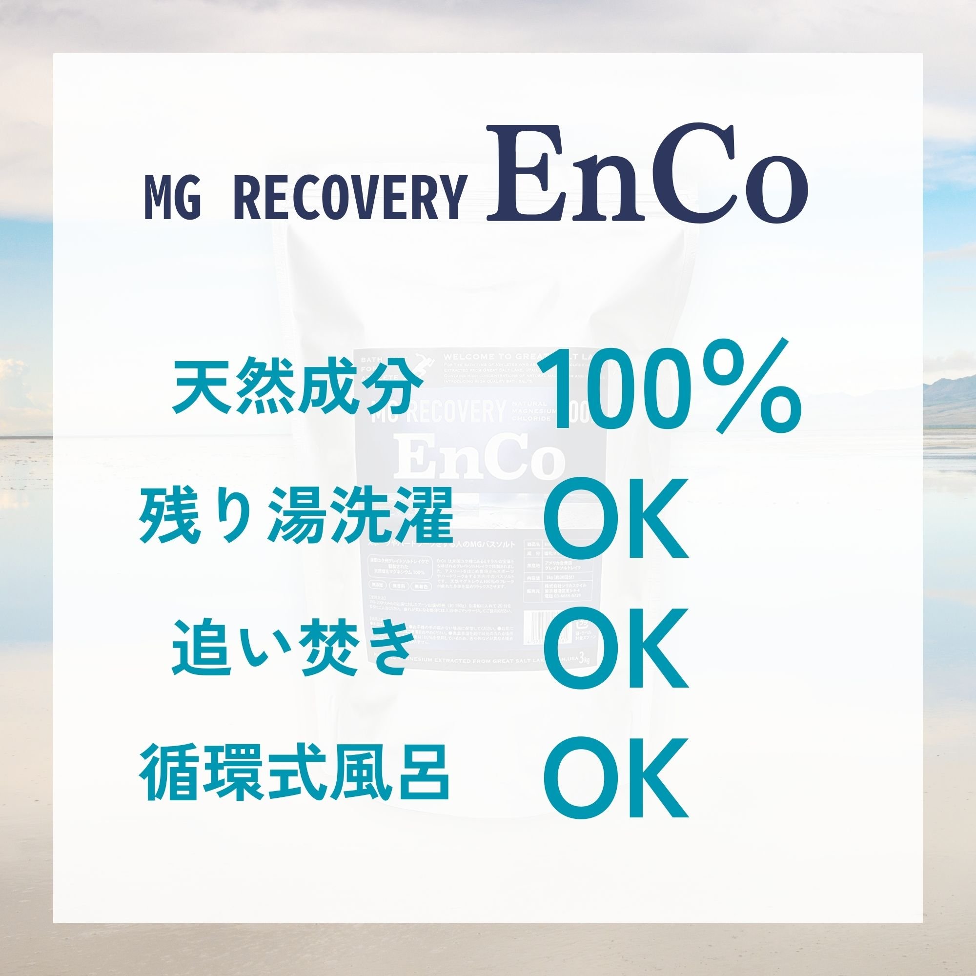 【EnCo】はグレイトソルト湖で精製された高濃度の天然塩化マグネシウムとミネラルが含有する高品質なバスソルトです。 |