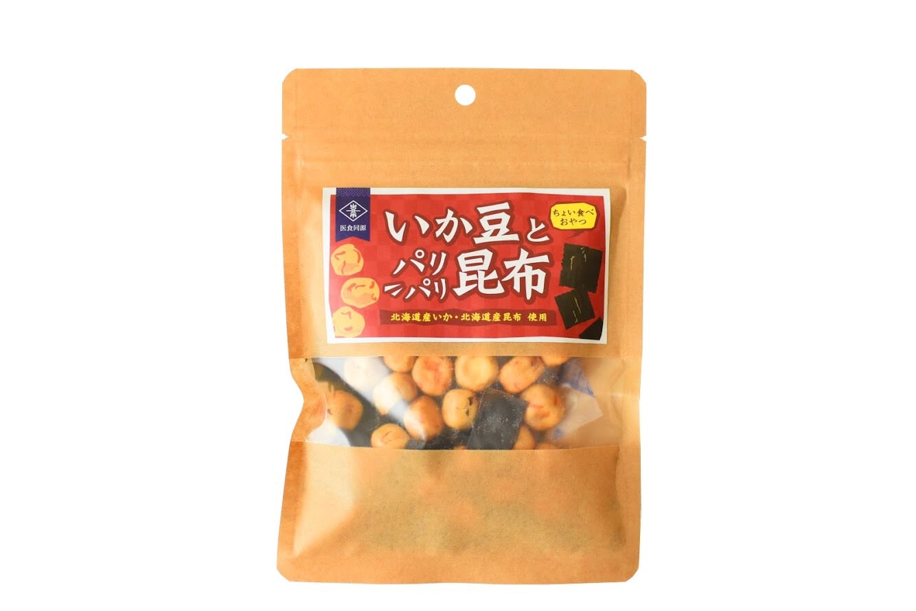 北海道産切りいかの風味たっぷりの創作豆と、パリパリとした食感が楽しい焼き昆布をミックス。 |