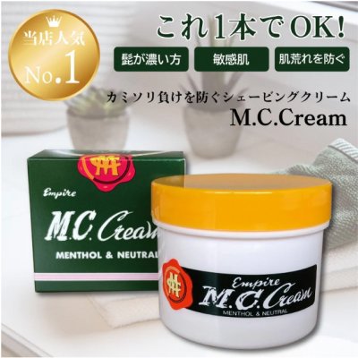 特に髭が濃い方、肌荒れが気になる方は、シェービングソープやジェルをつける前にMCクリームを厚めに塗布します。カミソ...