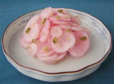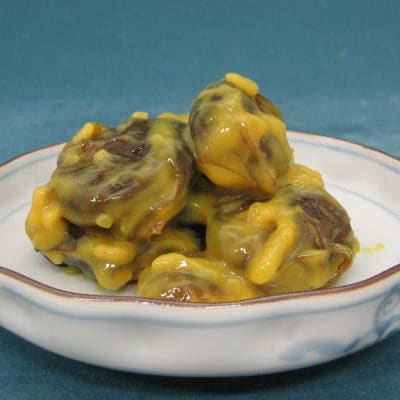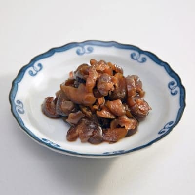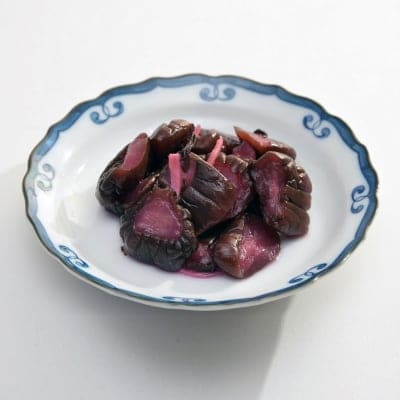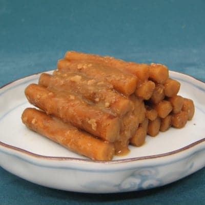 織田信長が派手好きであったことから、こんにゃくを赤く染めたと言う説があります。近江の名産として「おせち」の色どりにピリッと醤油味で炊き上げてます。